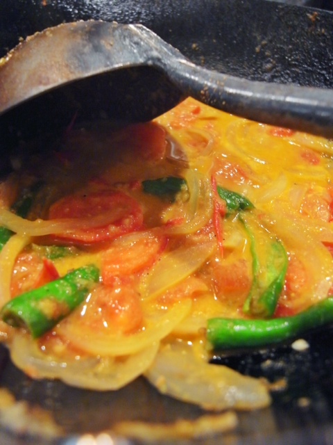 さっと茹でしたイカはぷりぷりで、これをざくざく切ったら、同じようにざくざく切ったたまねぎとトマト.....本場のスパイスでざっくり炒めた炒め煮.....もうなんたって香りがいいもの!(笑)