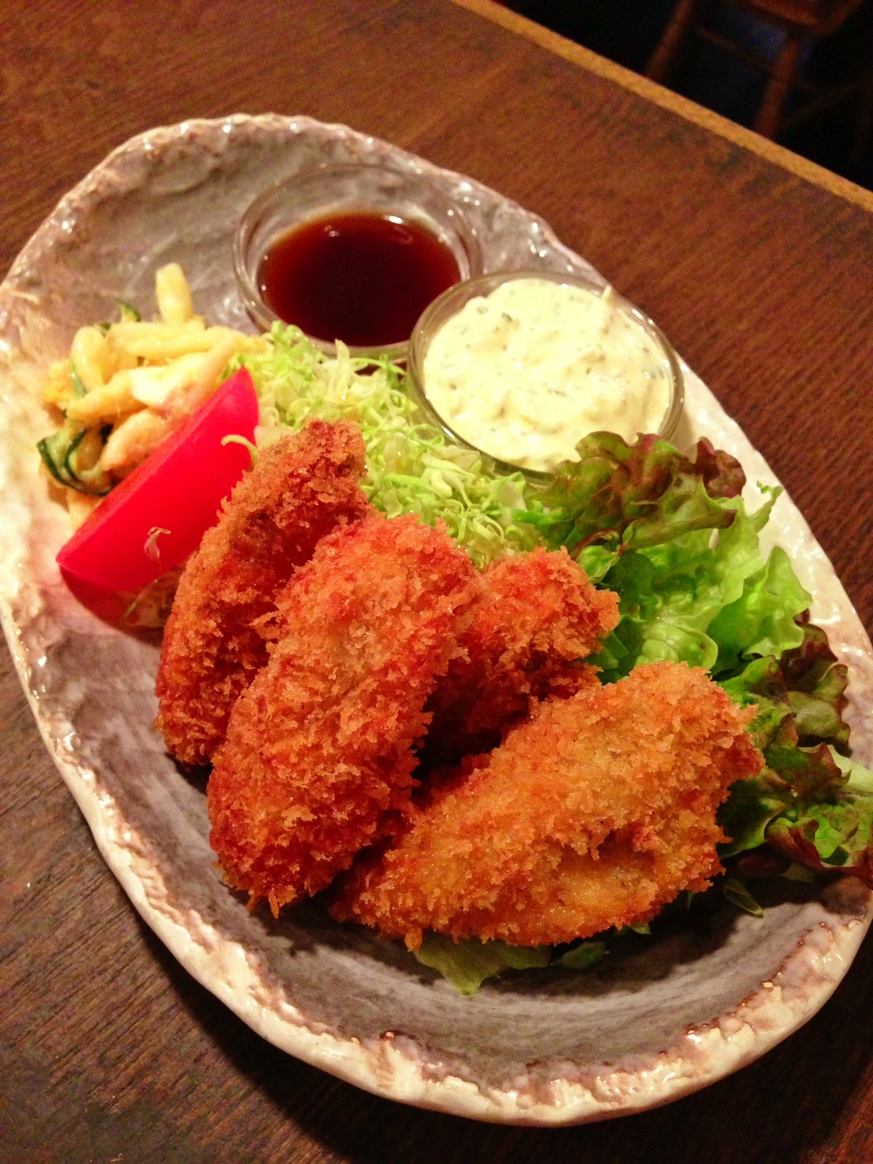 冬のフライの王様・カキフライ!からり揚げたてのあつあつカキフライに、濃厚な自家製タルタルソースをとろ〜り。あぁ、贅沢ってこうゆうことなのね(笑)。