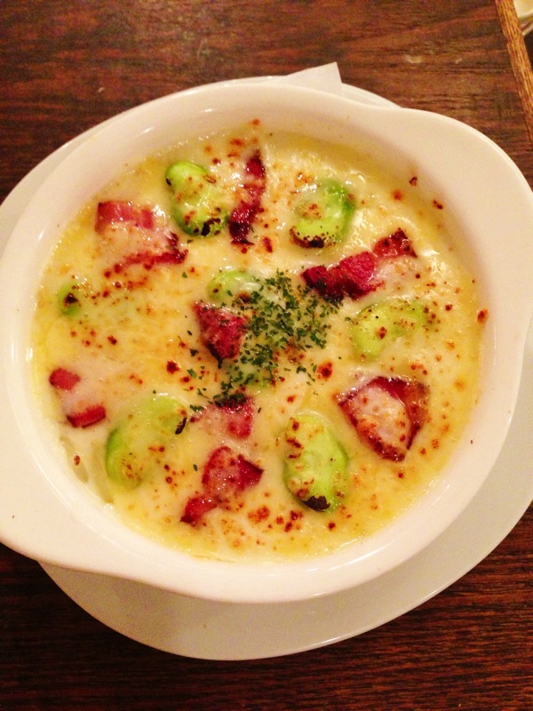 ほくほく新じゃがはにんにくの風味を付けたミルクでしっとり風味を付けながら煮たところに、まろやかな旨味のホワイトソースをたっぷりのせて、トッピングはさっくり茹でたつやつやのそら豆!そしてじゅうと一度焼いて旨味をとじ込めたベーコン!そしてもちろんとろ〜りチーズをのせてあつあつに焼き上げたグラタン!