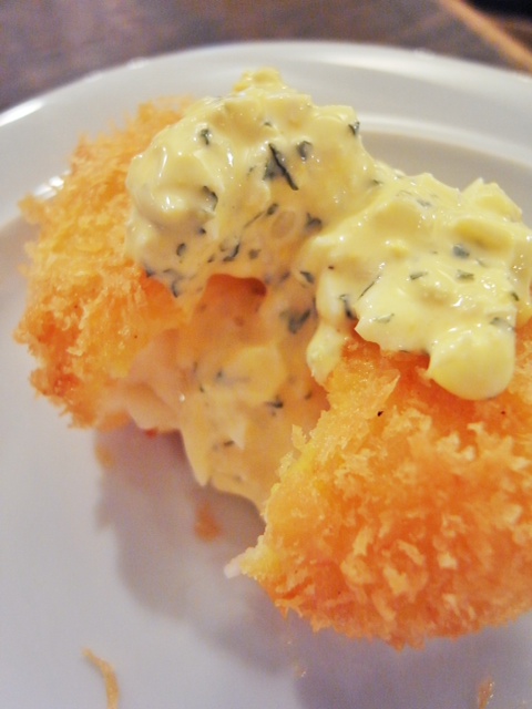 まずはそのホワイトソースは、もちろん当店自家製!時々お出ししておりますグラタンなんかでもおなじみでございますね、えぇ、まろやかでやさしい.....でもおいしさいっぱいの旨口ホワイトソースに、海鮮はイカの風味、たまねぎのみずみずしさ.....まるっとまとめてからりと揚げたて!