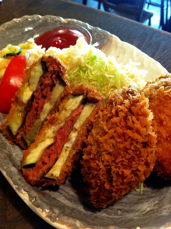 茄子に挽き肉あんを挟み込んだらコロモをつけて、からりと揚げたてさくさくたべたよう!....って、茄子が挽き肉の旨みしっかり受けとめたジューシーなフライ、あいや、たまらないですね、これ。