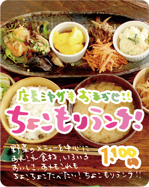 さてと、そんな今週末は.....そう、ここんとこ週末は定番?そろそろみなさんお見知り置きいただいてると思いますが、えぇ、週末限定!店長ミヤザキおまかせ!「ちょこもりランチ」!.....もちろん今週末もお出ししますよと、えぇ、最近「平日は出さないんですか?」なんてうれしいご質問もいただいたりしてるんですが.....そうですね、もちろんゆくゆくはお出ししたいとは思っているんですが....まだ今しばらくは週末限定となりそうです、えぇ、よろしくお願いします。