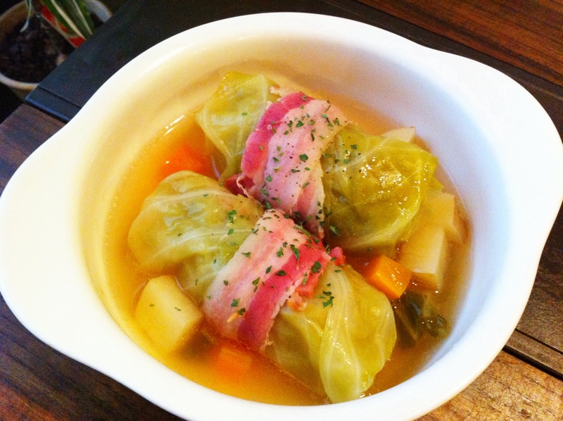 肉だんごのしかりした旨味をやわらかなキャベツの食感と優しい甘みが包み込んで、えぇ、ベーコンをきゅっと巻き付けた......シンプルなコンソメ味のミヤザキ家風ロールキャベツ!いや、店長ミヤザキが中学生くらいの時は3つくらいぺろりとたいらげたと書いておりますが、えぇ、ワタクシもホント好きだったなー、ロールキャベツ。