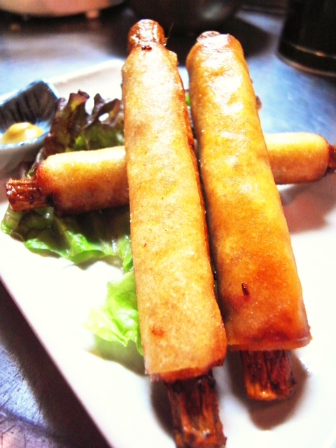 揚げたてあつあつカリカリの揚げ春巻き....中はシャキシャキごぼうと、ジューシー&ピリ辛!挽き肉の旨味、ほんのりオイスターソースの香りでまた食欲をそそりますね。からししょう油をちょいとつけて、カリッとたべれば、ビールがホントすすみます(笑)。