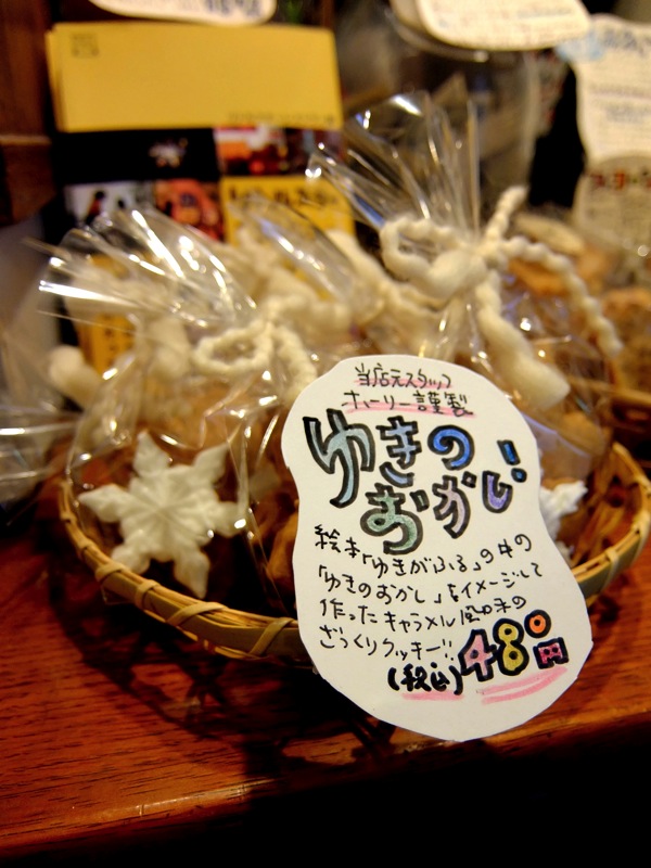そして.....絵本の中でふわふわころりがくれる「ゆきのおかし」!.....牧野さんたってのご希望で、当店元スタッフでお菓子職人はホーリー!「ナロクッキー」に続いて、今回もすてきなアイッシングのクッキー&キャラメルクッキーのセットを作ってくれました!こちらは480円、おみやげにおひとついかが?(笑)