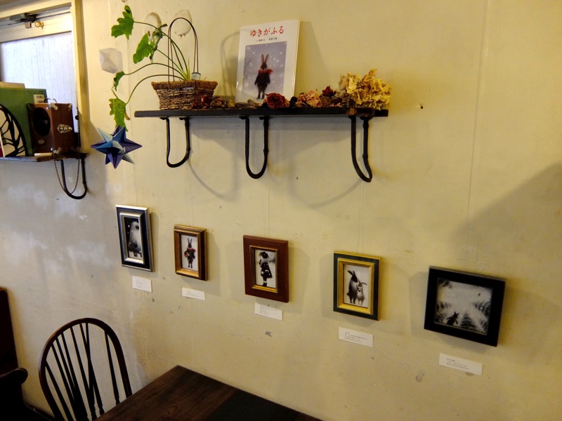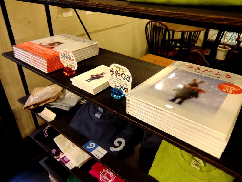 さて、入り口正面、店内奥の壁、棚の上には.....その絵本「ゆきがふる」、そして.....こちらも描き下ろしの原画は.....惜しくも(?)絵本になる直前の登場人物....って、ギリギリでまた変わったりもするんですね!(そりゃ大変だろうなぁ....)