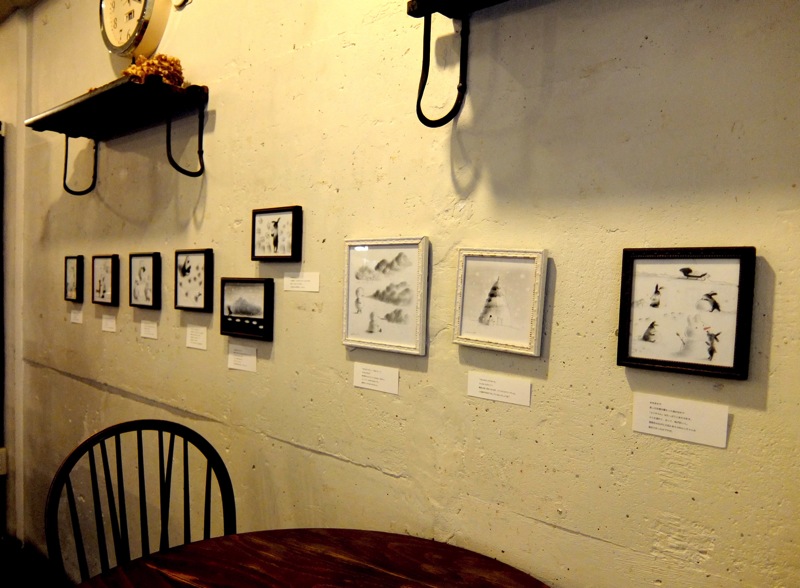 それにしてもこの展示、牧野千穂×Little Star Restaurant ...って銘打ってるわりには、さてリトスタさんはなにやってんの?みたいな(苦笑).....って、あー、写真ではちょっとわかりにくいかもですけど、店内天井に星や雪をモチーフにしたたくさんの手作りモビール.....って、いや、こっちの話はまた別のページでご紹介しましょうかね、えぇ、それはそれなりに、手間がかかっておりますのよ(笑)。