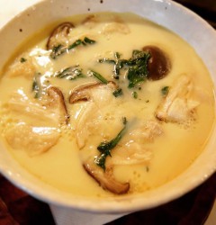 と、そんな今夜の茶わん蒸し、具は先週に引き続き、ぷりぷりきのこは丹波しめじ!とエビ、そしてむかごと三ツ葉風味を加えたあつあつ茶わん蒸し!