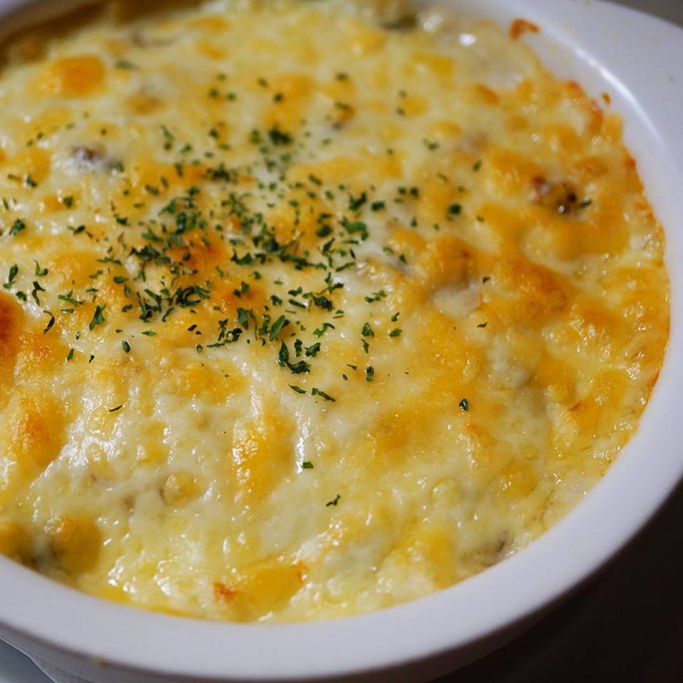 さくさくスライスしたじゃがいもの上に、フランベしたぷりぷりきのことさっと茹でしたたらのおいしさ!まろやかな自家製ホワイトソースでもあつあつグラタンがイイネ!