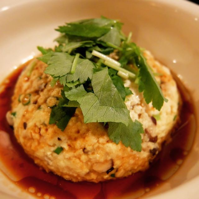ホタテの旨味のつまった蒸し豆腐、薬味もたっぷり入ってほっかほか、素早くごま油しょうゆだれで、いただきましょう。あちちちち。