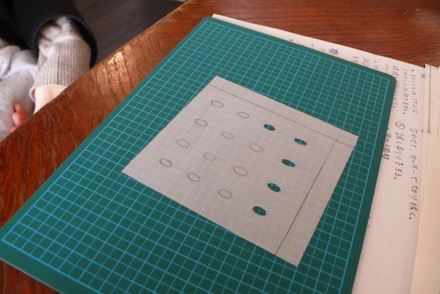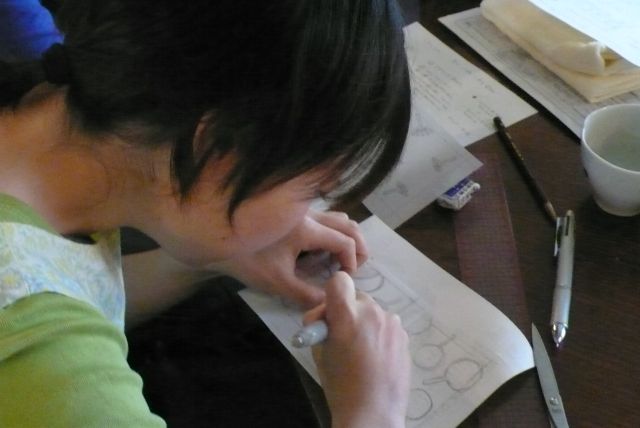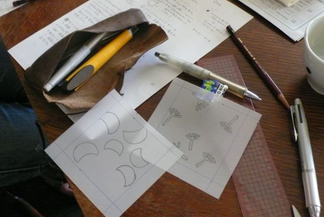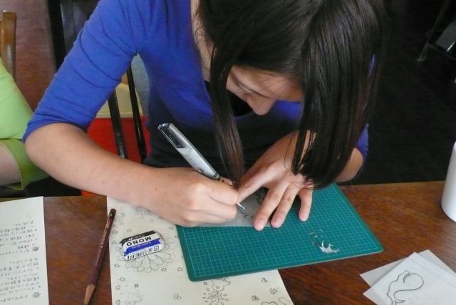 やっぱり数カ所ズレてしまってました。このまま刷ると形の崩れたうちわになってしまうので、片方の版を、もう1版に合わせてやり直します。今度は切り過ぎてしまわぬよう、1カ所切り抜いては版を重ねてみる、を繰り返します。でもやっぱり切り過ぎて、もう一度やり直し!がんばれ、がんばれ~(笑)