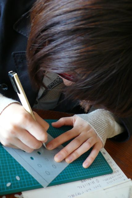 細かい丸や曲線をくり抜くのは結構難しい。カッターを軸にシートを回す様にすると、きれいに切れます。もし、失敗しても…ステンシルではそれが味になることもあります。いのさん上手です。