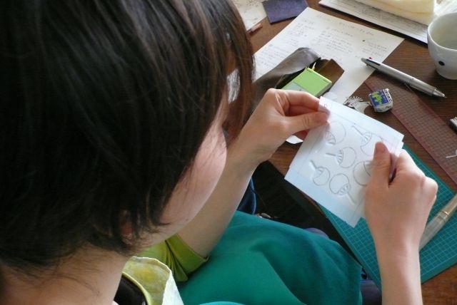 デザインが決まったら版を作ります。ステンシルシートにイラストをトレースし(シートが透明なのでイラストを写し描き出来る)、カッターで線の内側を切り抜きます。