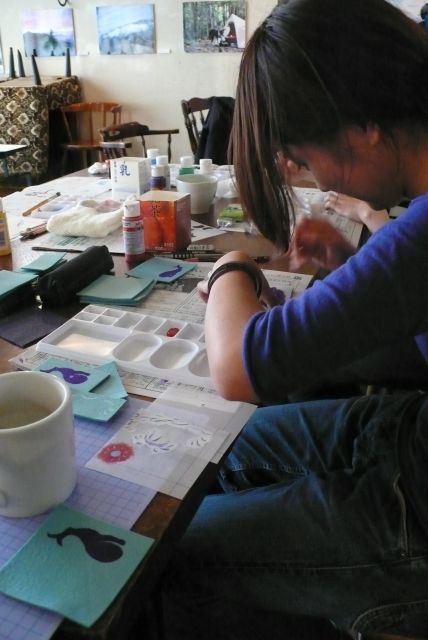 版が出来たら、ステンシル用絵の具で色をのせていきます。