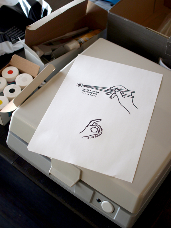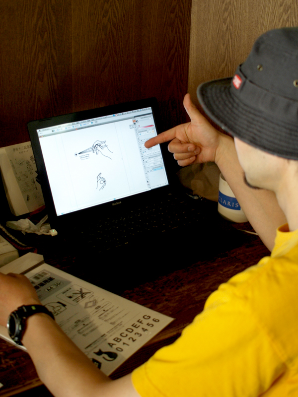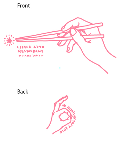 ま、でもそうも言ってらんない時期になりまして....だったらあれはどう?と店長ミヤザキがすすめてくれたのが、この「正しいお箸の持ち方」デザイン.....お店の紹介パンフレットを作る時に作ったモチーフだったんですけどね、ちょっとメインになるには地味じゃない?と思いつつも、でもうちのごはんは基本的になんでもお箸でたべるメニューですし、飲食店のTシャツとしては、なかなかいいんじゃない?と、結局この案で行くことに。