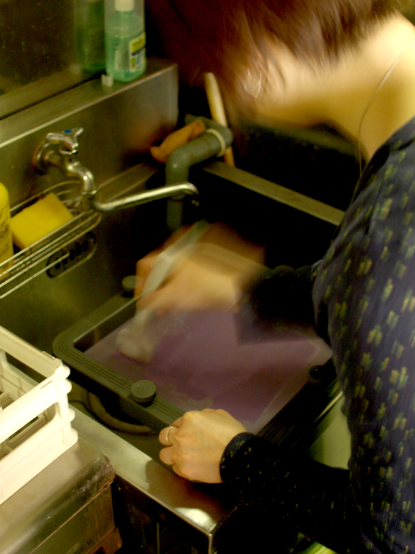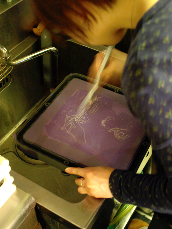 水で洗いながら.....ブラシでさらりとなでつつ、図案が出てくる.....感光しなかったところがスクリーンから抜けていくわけですね....でも、この塩梅が難しい....