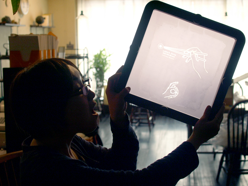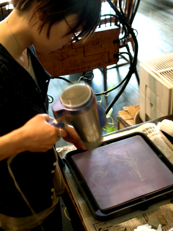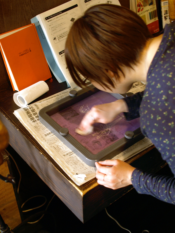 スクリーンの版を枠に貼り、図案を重ねて、スイッチオン!.....しばらくのちに感光完了!暗いところでやれば、わりとカンタンカンタン、アセってやんなくても大丈夫。