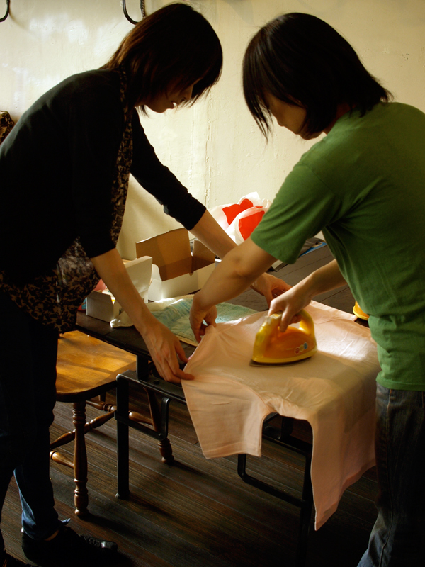 と、そのころ店長ミヤザキとぬまっちは.....ベースになるTシャツをひたすらアイロンがけしておったのでありました.....明日につづく(笑)
