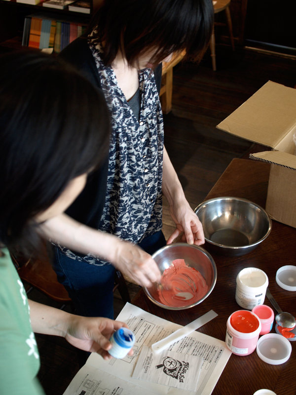 店長のミヤザキです。まずは、プリント用の専用インクを混ぜ合わせて色の調整をします。ここは油絵をやっているリトスタきってのアーティスト、ぬまっちにおまかせ。絵の具の色は派手でも、プリントしてみるとそうでもなかったりするので要注意。