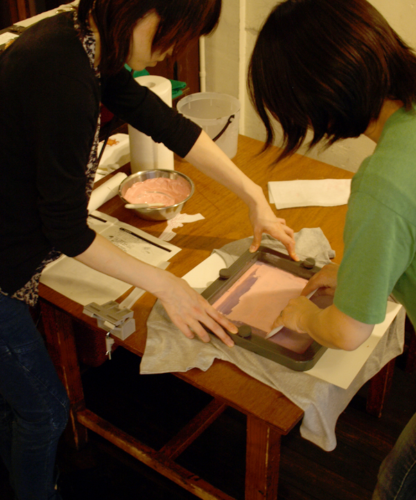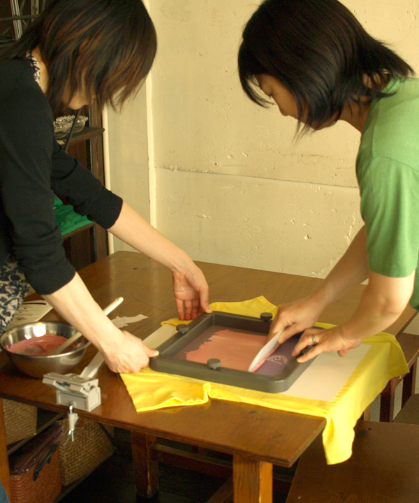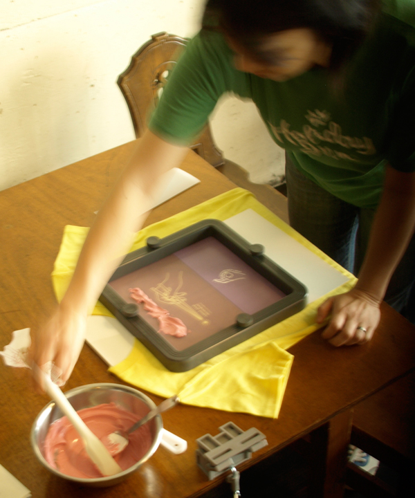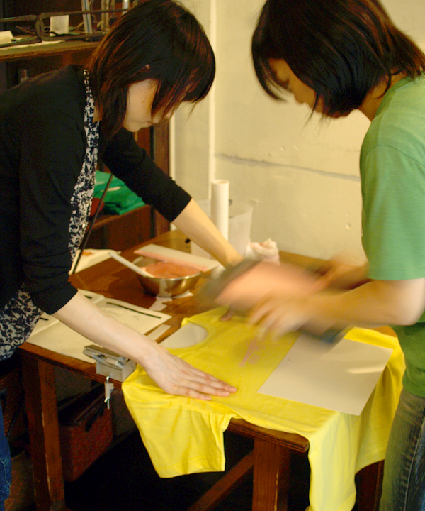 それでは...と、スキージという印刷用のへらみたいなもので、おそるおそるインクを伸ばす...力が弱いときちんとプリントされないから、しっかりね...