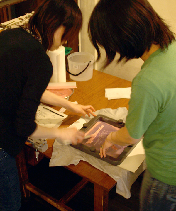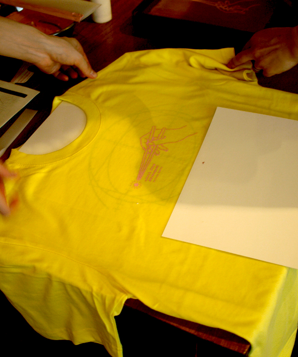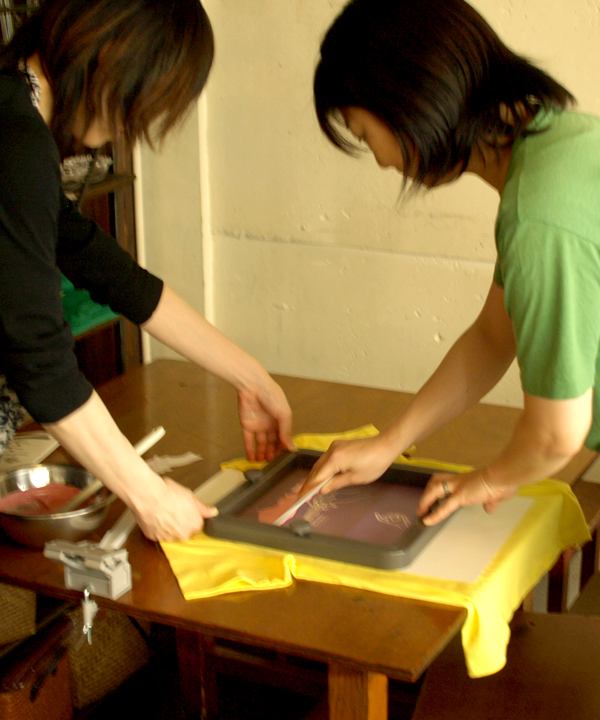 さて、前回ワタクシokayanによる図案の完成から、「Tシャツくん」によりますシルクスクリーンの感光、そしてはま子による....そのシルクスクリーン版の完成までをお送りしましたが、えぇ、今日はいよいよ本番、刷りに入ります。