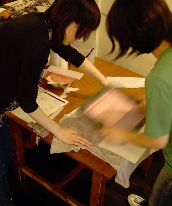 ぱっと一枚刷った分には、版もきれいですし、ピタッときれいにインクが載ってて.....おぉ!いけんじゃん!と一同オオヨロコビだったんですけどね、すぐに版がインクで目詰まりを起こし.....それに気付かずに失敗を重ねる.....4枚ほど連続でダメにした時には.....もしかしたら1枚もまともに刷れないんじゃなかろうかと、弱気なわたくしは暗澹たる思いもしたんですけどね(苦笑)。