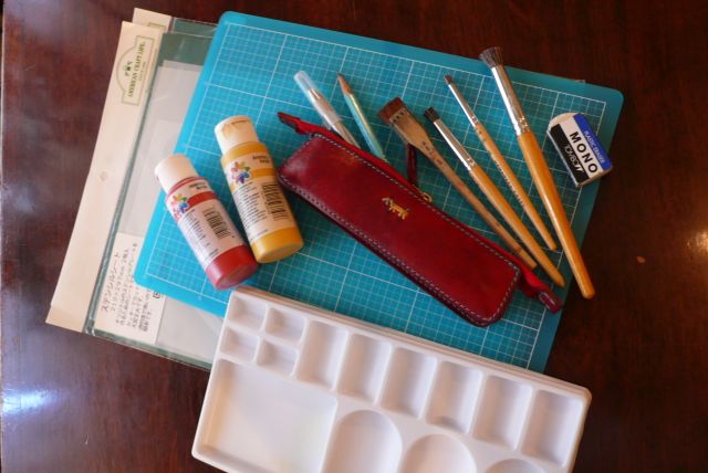 鉛筆、紙(下描き用)、定規、カッター、カッティングマット、ステンシル用筆、パレット、筆洗い器