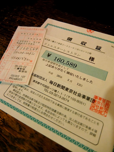ひとついい機会でしたので、翌12日、当店の小さな募金「リトスタぼきん。」、みなさんからお寄せいただいたお気持ち、おこころざし......1年半ぶりに「毎日希望奨学金」に振り込んでまいりました。