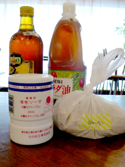 とにかく仕込みにむけて、必要な材料を揃えることにしました。キッチンスタッフにお願いして、廃油、米ぬかをストックしてもらい、薬局で苛性ソーダを購入。苛性ソーダは劇薬であるため、印鑑を持って薬局で購入する必要があります。固形石けんを作るためだと伝えれば、さくっと買い求められるのですが、初めての劇薬購入....やっぱり少しどきどきしました。