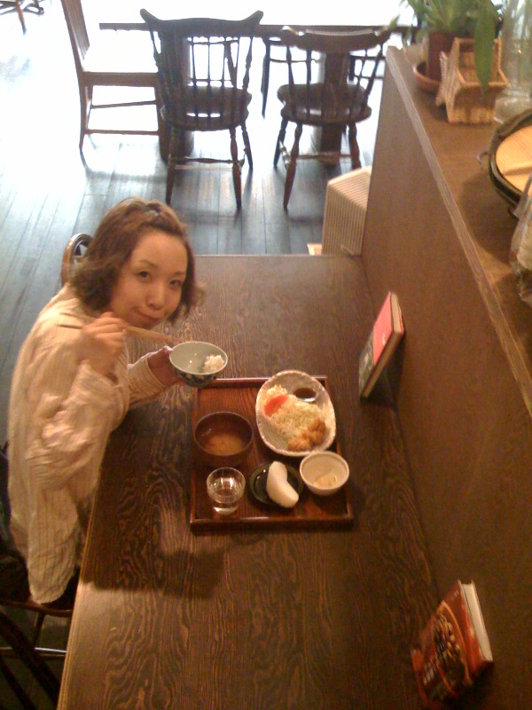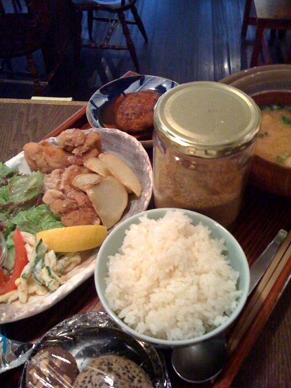 連休明けの賄いはいつもにぎやかで、ワタクシokayanの賄いは、ラ ンチの「鶏のから揚げとポテトフライ定食」(ミニハンバーグ付き)にフ カザワみやげのクッキー、僕らのおみやげチョコレートクランキー(2 種)、そして最後に食後の炒り米ぬか!あまりににぎやかで、アッキー曰 く…おじさまランチてすね…って、アッキー、誰でもおじさんにはなれる けど、おじさまにはなかなかなれないものなんですよ(苦笑)。ワタクシ もなれそにないですけど(笑)。(お)