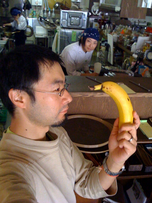 朝ご飯にたべそこなったバナナを持ってきました…えぇ、遅ればせなが ら、バナナダイエットのつもり。なんて言ってたら、バナナ、もう古いで すよ、今はとろろ昆布ダイエットですよ!とアッキーに言われてしまいま した(苦笑)。いずれにしても、髭っ面で申し訳ない。(お)
