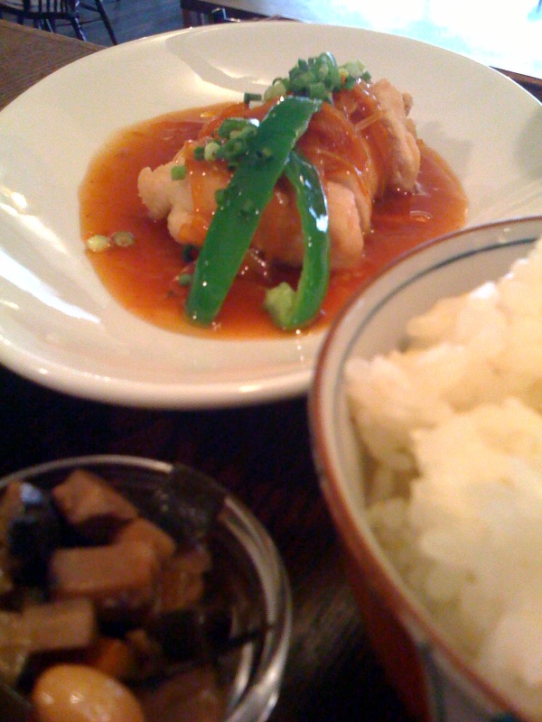 ランチで完売御礼だった「サバのから揚げ・甘酢あんかけ」の、その甘酢あんで「鷄のから揚げ・甘酢あんかけ」!まさに賄いならでわの一品…って、でもやっぱり甘酢あんはサバの方が合いますね(笑)おいしかったですけど。(お)