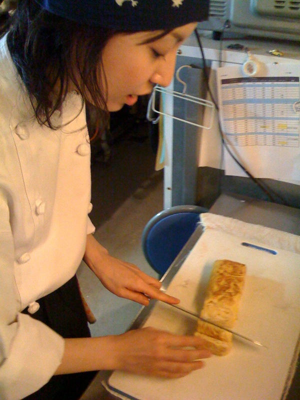 久しく中断しておりました、キッチンスタッフくろちゃんの玉子焼き修行、本日 からまた再開されまして、その第一弾…しばらく焼かなかったとはいえ、料理の 腕が上がった分は確実に上手くなってますよ!免許皆伝も遠くはない!楽しみ 〜。(お)