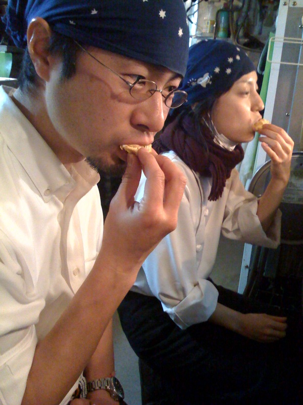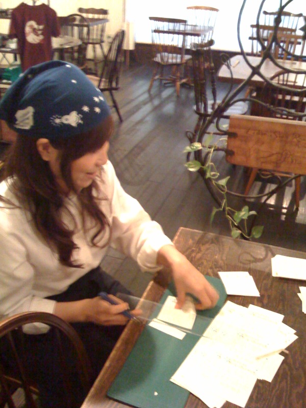 テイクアウトのスコーンやパウンドケーキに添えるおいしい食べ方の用紙 をせっせと切ってくれるカサハラさん…こんな地味な仕事ですけど、誰か がやらなくちゃ、あの紙はないのよね…ありがとう!今日は昼夜通し、頼 んます!(お)