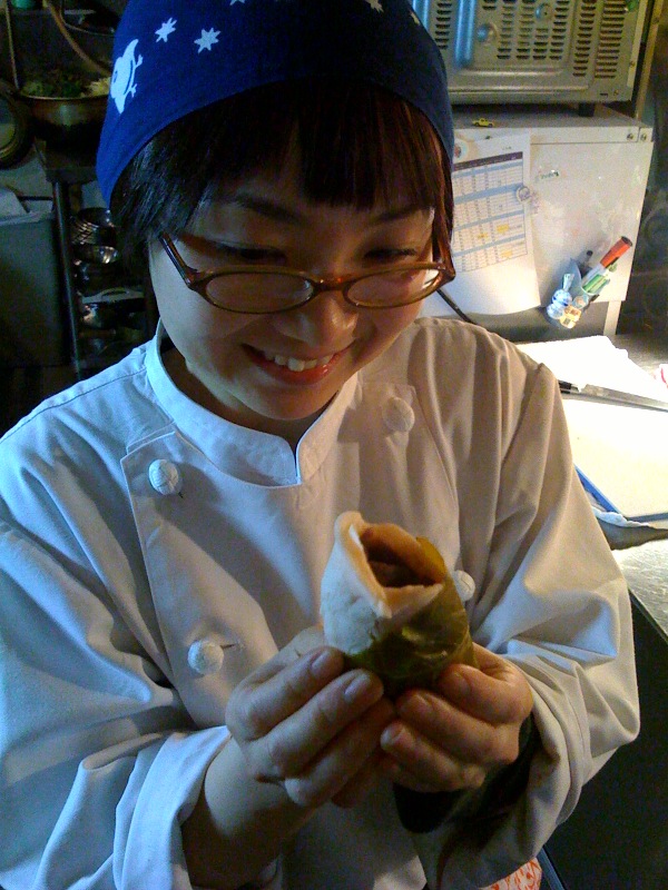 さっき「風のすみか」さんまで毎月新聞を配達に行ったついでに、中央通 りの市村屋さんで桜もちを購入。ホントは無類の道明寺好きなワタクシで すが、たまにはね、関東風の桜もちもいただきましょう…モデルははま子 さんにお願いしました(笑)。(お)