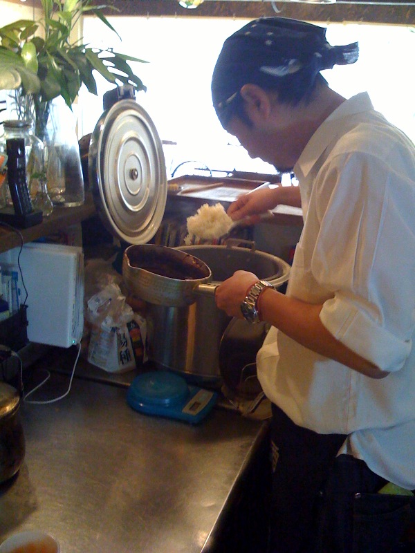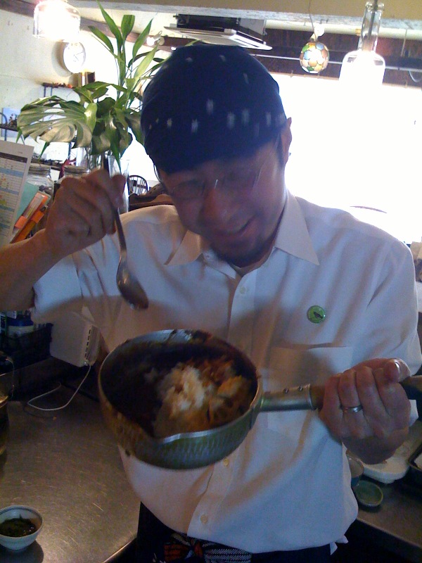 本日のランチも大入り御礼、ごはんもなくなりましたが、ハンバーグに日 替わりもすっかり完売…ということは、ワタクシ昨日に引き続き、お昼の 賄いはオトコの鍋カレー!いただきます…まずは鍋に入ったカレーにごは んをえいやと投入です!(笑)(お)