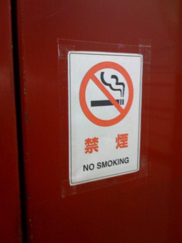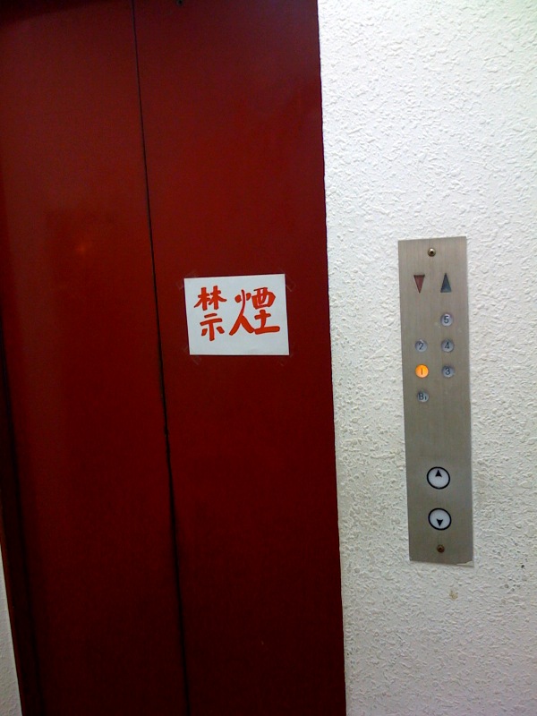 件の「禁煙」の紙、ありきたりなサインの紙になっちゃいました…なんで もエレベータ屋さんがこれに替えてくれたんだそうな。個人的には前の手 描きの方が全然いいんですけど…新しいのはあんまりふつうすぎて、禁煙 を促す効果が薄いような気がしますか…。(お)
