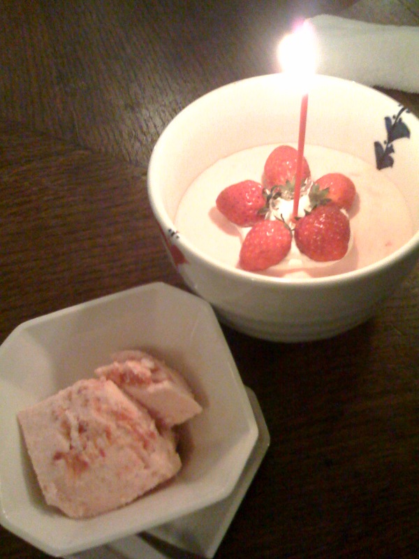 つぶつぶいちごのババロア丼!(笑)お誕生日のご宴会、シメのバースデ イケーキ代わりにとリクエストいただいたのが、この夢のババロア丼!ち なみに、普通に考えて、三人前くらい??とにもかくにも、激しくご満 悦、よろこばしからずやでございました、ハイ(笑)。(お)