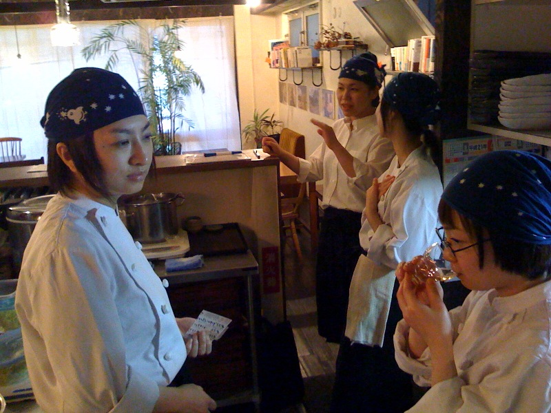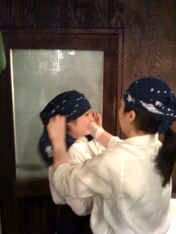 忙しい週末にばしばし入ってくれていることもあって、めきめき仕事を覚えてく れております新人のワコちゃん…って、いまだ慣れないのが、手ぬぐいをすてき にかぶること…今日はアッキーが先生!はたして〜っ!(お)