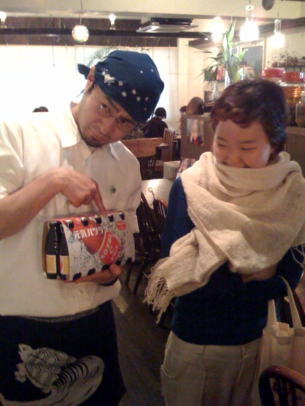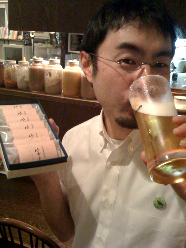 お久しぶりにご来店いただいたすてきな女性のお客さんに、遅ればせながら〜 と、昨年に続いて誕生日プレゼント、加賀藩ご用達の和菓子をいただきました。 閉店後、お疲れビールのお伴にごちそうになります!ありがと>Nさん!(お)