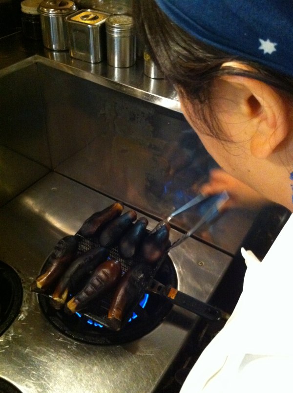 ヨメに食わすな、なんで申しますが、えぇ、今時そんなこと言ってたらね(苦笑)。ということで、ワタクシのヨメでもあります店長ミヤザキ、丸々おいしそうな茄子を焼いておるところでございます…是非是非~!(お)