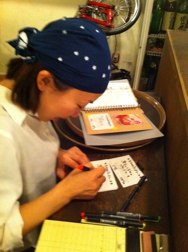 日付変わって本日から、パウンドケーキが好評でした「ジンジャーパウンドケーキ」からざっくりしっかり目の「黒豆とくるみのパウンドケーキ」に切り替わり......ワタクシがさらりと書いてコピーした告知の紙に、伊藤ちゃんがあれこれと蛍光マーカーで飾りを書いてくれております.....土曜日の夜、閉店後、居残り伊藤ちゃんの本日最後のお仕事であります、助かります、ハイ(笑)。(お)