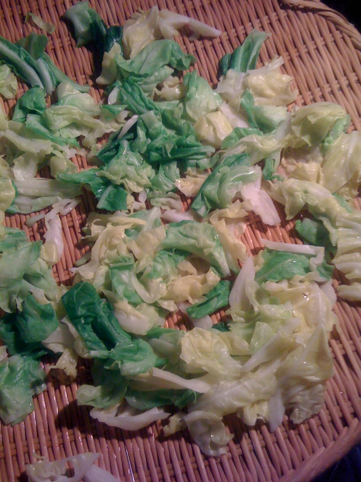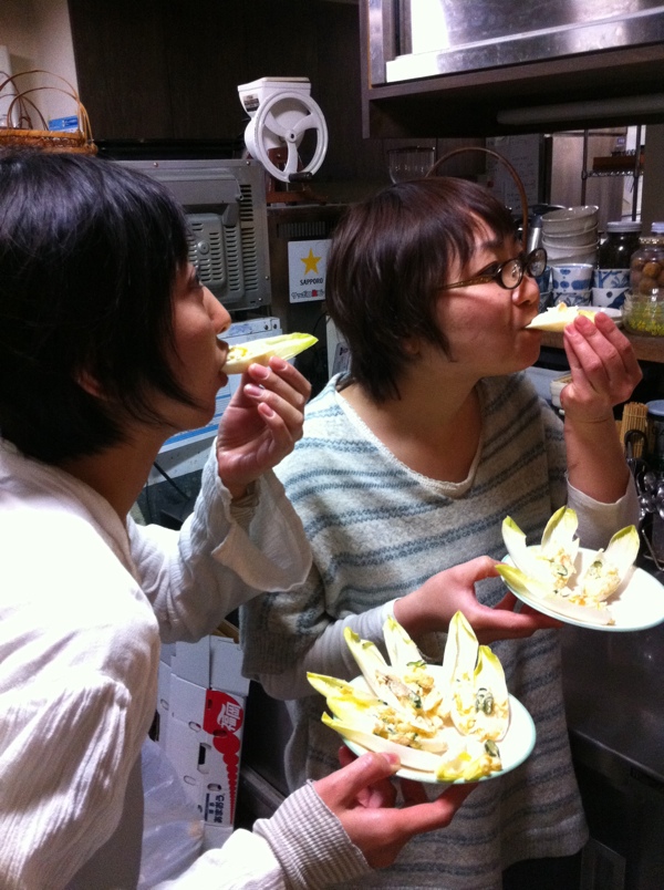 今日twitter経由で、野菜もらってもらえませんか〜と、わざわざ持って来て下さったお客さん.....えぇ、さっそく今夜閉店後にいただいております(笑)。チコリに当店定番中の定番、ポテトサラダと、ちょっぴりゴルゴンゾーラをのせて、えぇ、年度末、今夜は忙しかったねと、はま子ときめちゃん、もちろんワタクシドモもいただきます!またこれがビールのつまみにイイネ!(笑)ありがとうございました!(お)