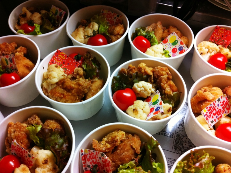 あきゅらいず美養品さんの「森の楽校」に来ている福島の子供たちに、おやつを提供しました。おやつと言っても、今回はチキンバスケット!当店自慢の鶏のから揚げと、カリフラワーのあちゃら漬けをかわいくつめこみました。おいしく食べてくれるといいなあ!(麻)