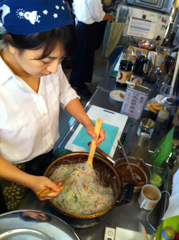 ひんやり春雨の酢の物....お代わりされる方がいらっしゃる程、好評な夏のお通しです、えぇ、店長ミヤザキがあんまりすっぱいものが好きじゃないので、酢の物といっても、そんなにすっぱくはないですけどね〜。ワタクシも好物であります、ハイ。(お)