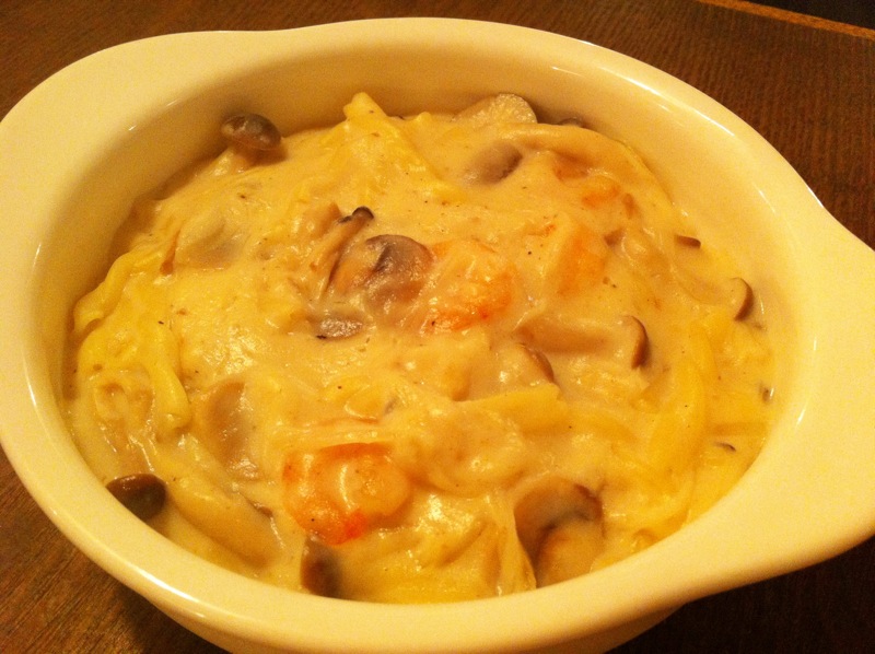 開店以来、ずっとやりたかったメニュー、新兵器を手に入れて可能になりました!ズバリ、グラタン!今回はエビときのこのマカロニグラタンです。店長の大好物なんだな~。あとはチーズをのせて、焼くだけです‼(麻)