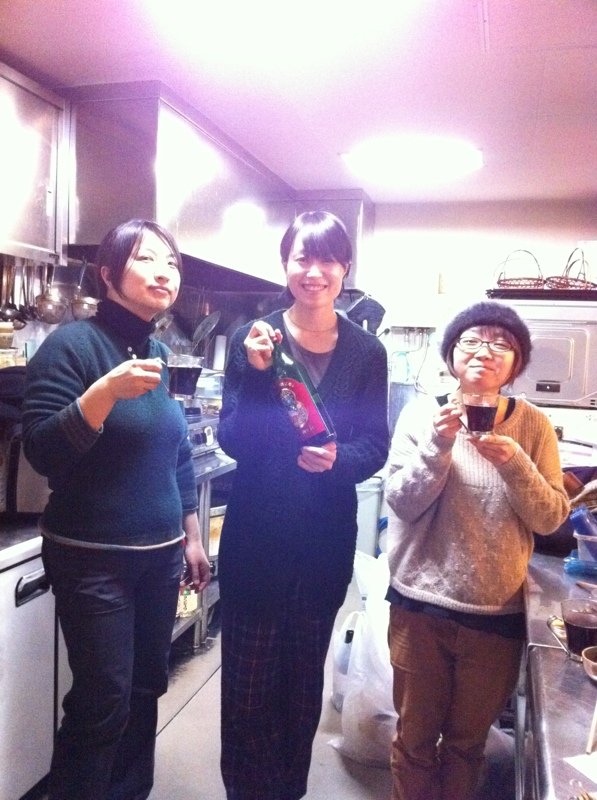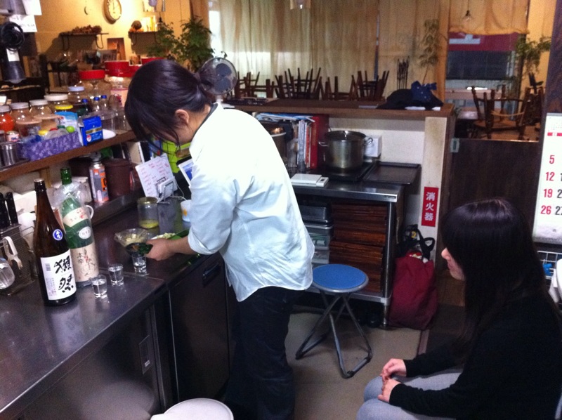 昨夜仕事上がり、若干二十歳、当店では一番の若手スタッフのにゃんさん…って、実はなかなかお酒はイケる口?ということで、今夜は日本酒いってみましょう!と、店長ミヤザキ、定番の日本酒を準備中…見守るにゃんさんも、なかなかイイネ(笑)。(お)