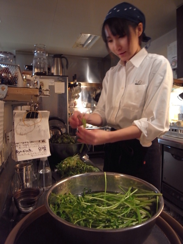 お!今度はホーリー、選別しながらちょこちょこ摘んでいるのはセリですね!あぁ、春の七草のひとつ、さっぱりした香りかいいですよね!…って、これは本日のおススメ「大根とせり、ホタテのサラダ」ですね!春はそこまで、るるるる〜っと。(笑)(お)
