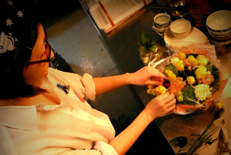 皆様からいただいた8周年お祝いのお花をケアしております、いのさん。入れ替え差し替え、アレンジメントし直し中。サスガですね〜。ちなみに、ガーベラの茎はお水に浸けすぎるとすぐに腐ってしまうので、要注意なのだそう。いや、サスガです!(ぬ)