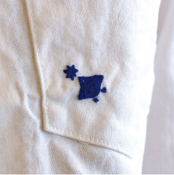 - ワンポイント刺繍を担当してくれたのは当店元スタッフのはまちゃん!位置は、ペンをポケットに差しても隠れない左下に。リトスタ千鳥をモチーフに、鳥はチェーンステッチで、立体的に、星は光っているように、中央から外に向かって刺しました。